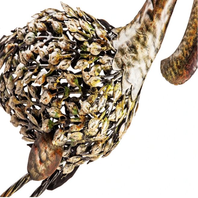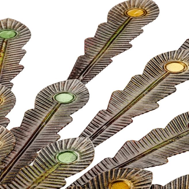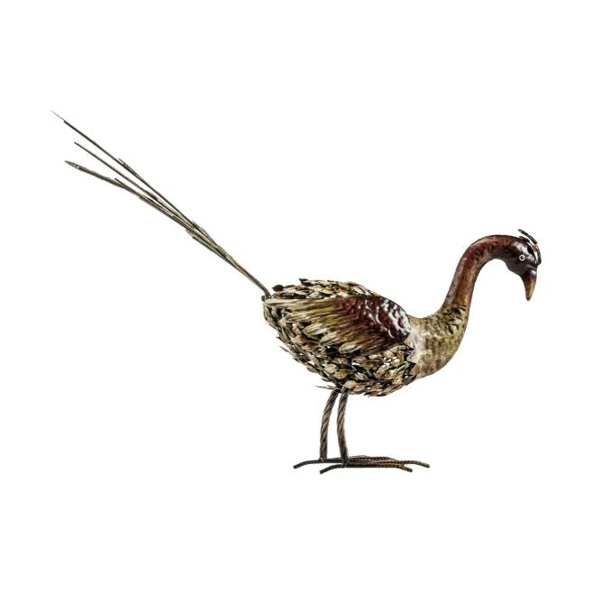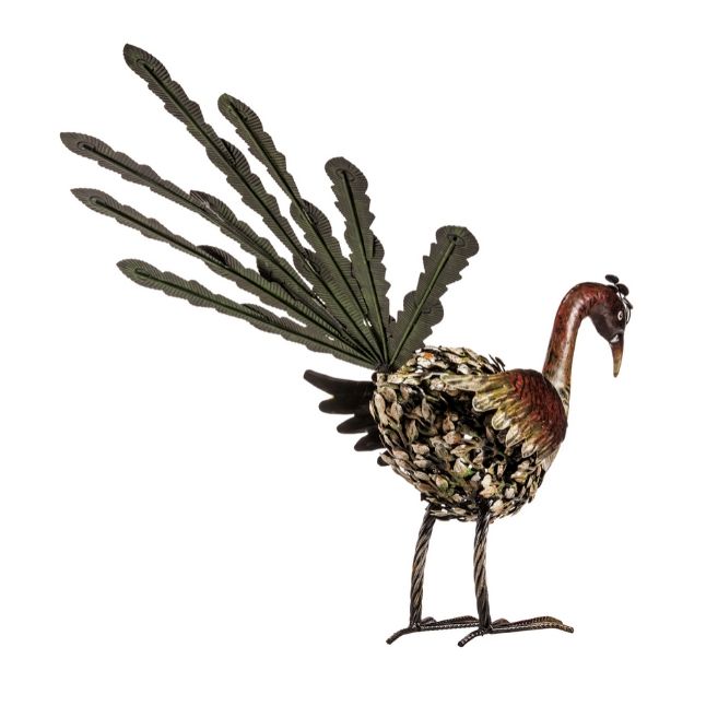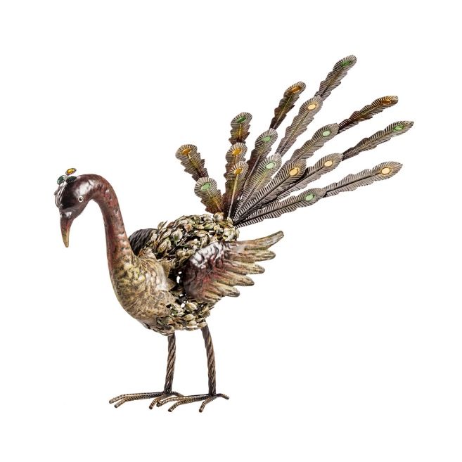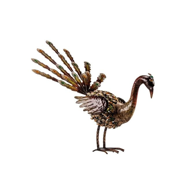A poised peacock anyone would love to have gracing their home, The Bella is at once majestic and rustic. This hand-crafted metalwork sculpture has the patina you look for in a rustic, authentic piece for your collection. Featuring exquisitely detailed, layered metal feathers and a proud plumage on its tail, The Bella by The Barrel Shack brings you a stunning piece for your collection. Measuring a little over 31 inches long, from head to tip of the tail feathers, Bella deserves a prominent place in a country lifestyle home.
