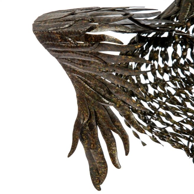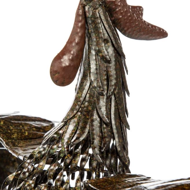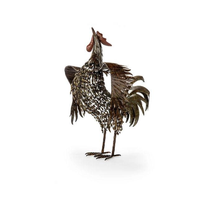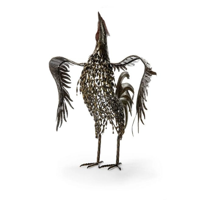 A proud cock with his head thrown back in mid-crow, the Caesar is intricately designed and hand-crafted metal works with a fine sense of detail that, together, makes an impressive sculpture. The metal is reclaimed-looking and shows its weather-worn patina to create a blend of colors that give depth and interest to this piece. Layers of metal feathers on its head, neck, and wings give the Caesar a volume usually not found on metal sculptures.